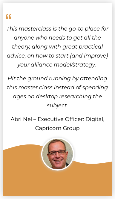 - “Alliances & Partnerships is the new leadership” and by attending the Alliance Masterclass your team will gain new leadership skills to use throughout your business.